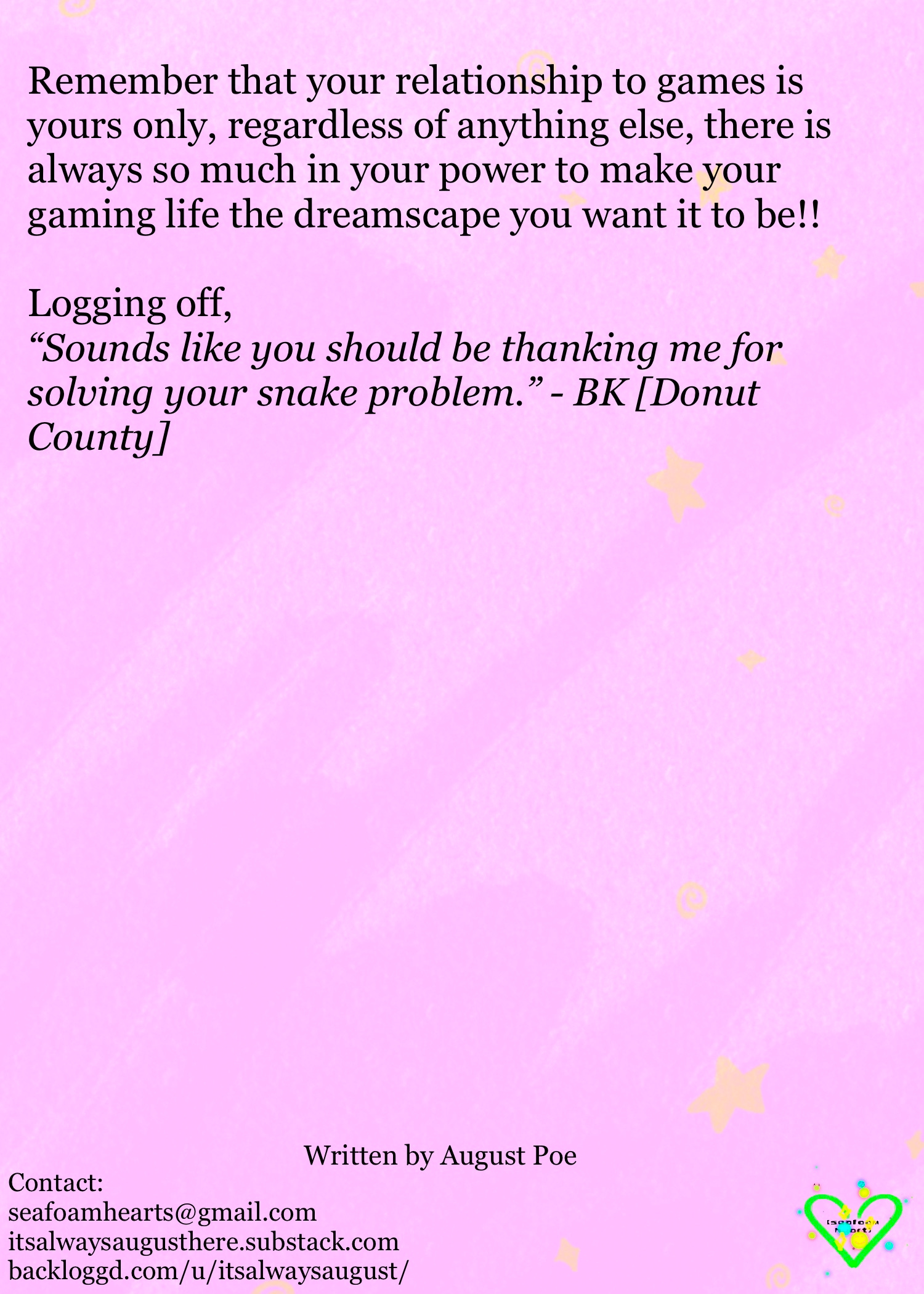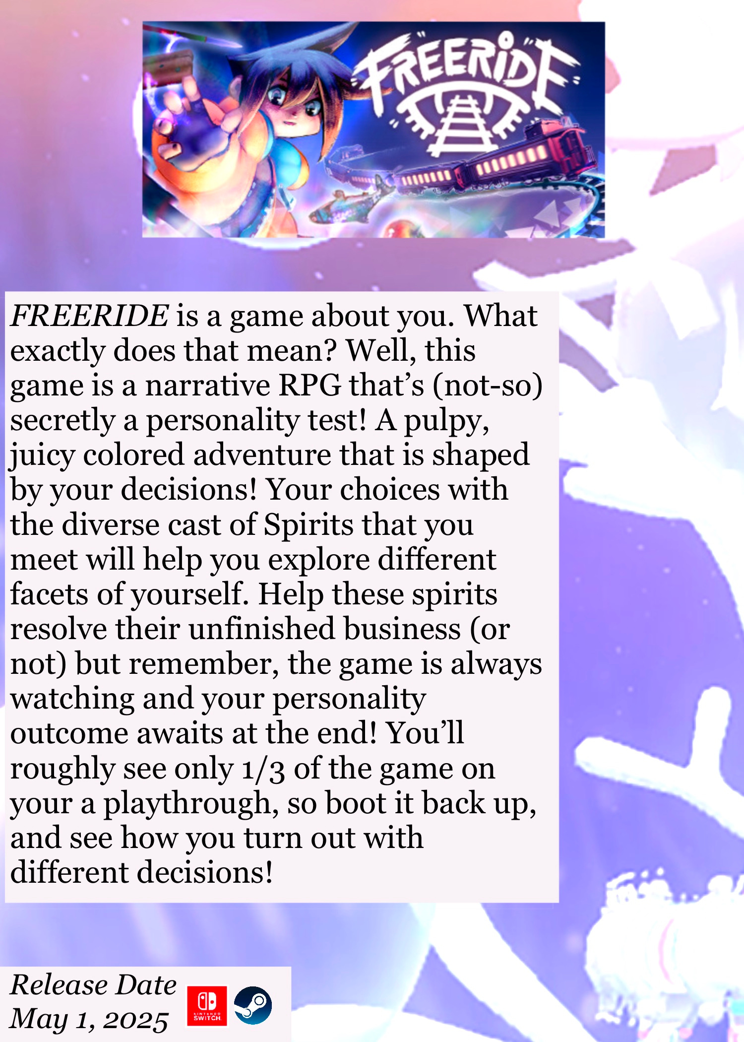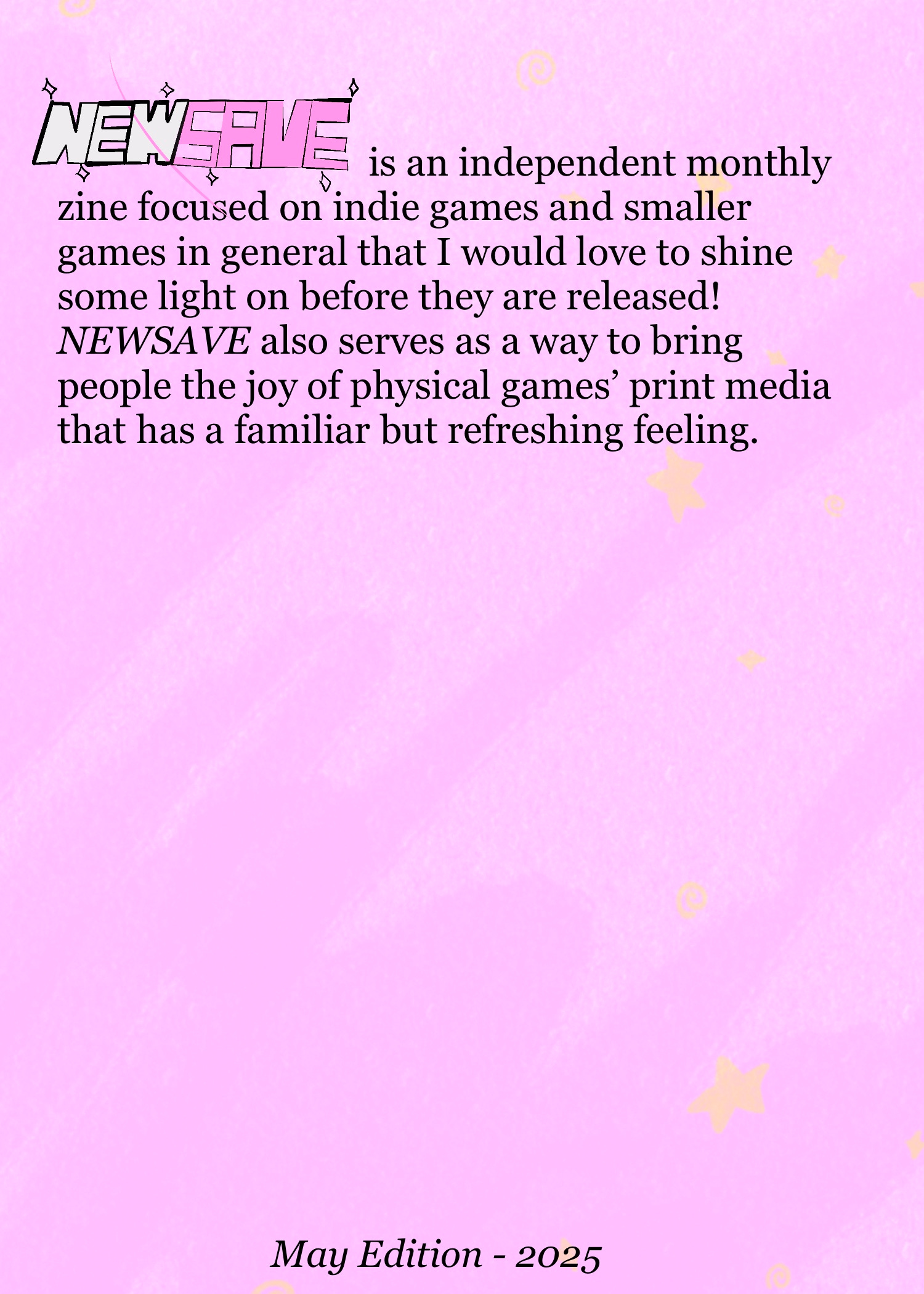 Hello friends, I have exciting news to share! I am launching an independent monthly gaming zine focused at shining a light on indie games and smaller games in general! NEWSAVE aims to bring a personal feel to a digital and physical zine that is sure to put games in front of you that you haven’t heard of! I hope that you have fun reading and find some games to look forward to each month!